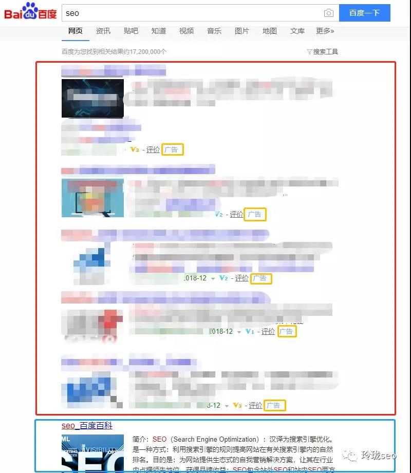 為了避免打廣告嫌疑,敏感信息打了馬賽克。可以看到紅框中都是sem的展示結果,每一條記錄分別都被打上了“廣告”的字樣,也就是說他們都是參與搜索引擎官方付費推廣的,你點擊一次他們的網站,他們就要花掉一筆推廣費用。這也是人民幣玩家的游戲。而籃框中的seo百度百科結果便是seo優(yōu)化做上來的第一名。舉個這樣的例子大家能更好的理解seo和sem的區(qū)別了嗎?